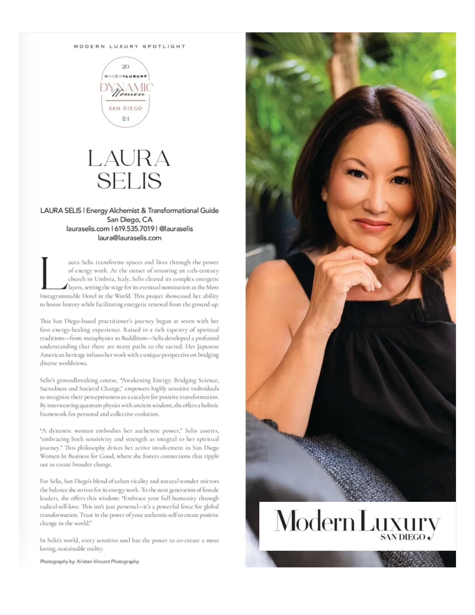 "Laura Selis transforms spaces and lives through the power of energy work. Her recent project—clearing an 11th-century church in Umbria, Italy—earned a nomination for Most Instagrammable Hotel in the World, showcasing her ability to honor history while facilitating energetic renewal....